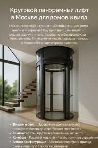 | Круговой стеклянный панорамный лифт | Виллы, загородные дома, клубные дома | 360° остекление, компактность, акцент на интерьере |